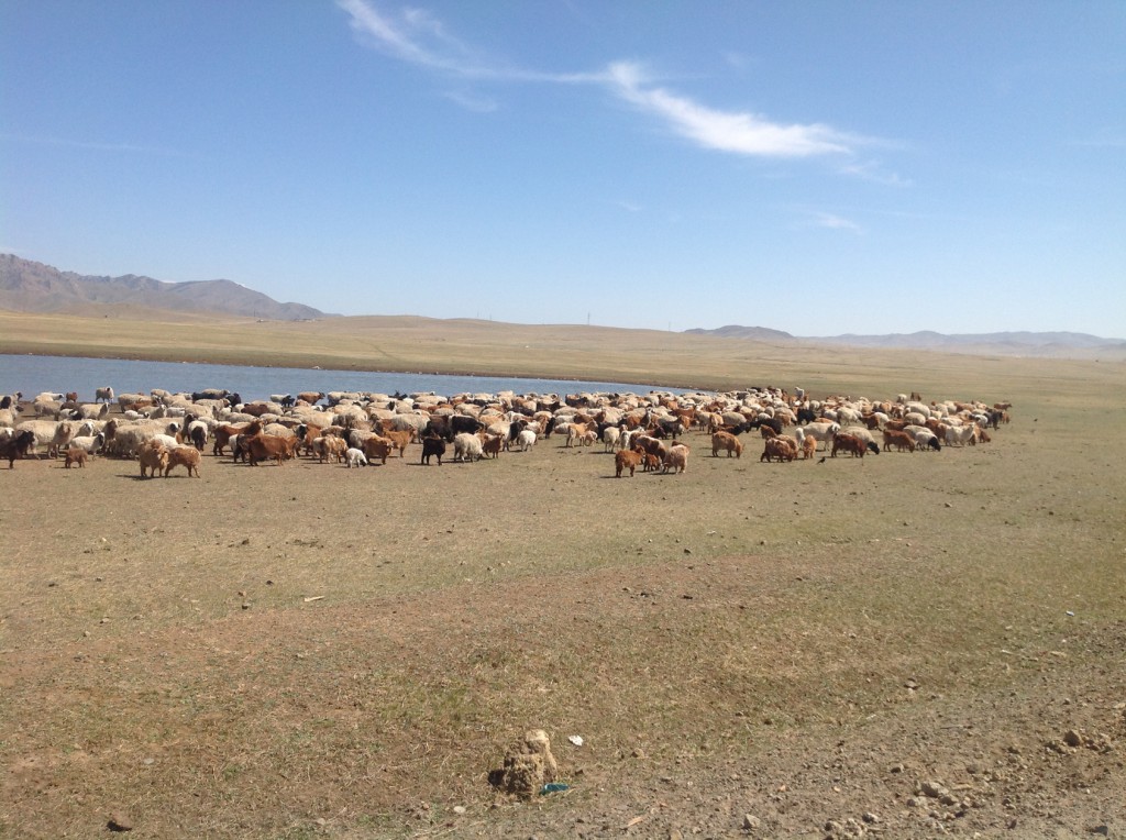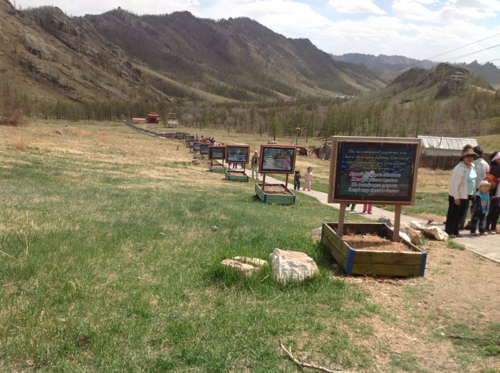 Kaupunkiin on tutustuttu ja hotelli järjesti meille nopeasti auton ja tulkin maaseudun kohteita tutkimaan. Ensimmäinen määränpää oli Tsingis Khan muistomerkki noin 50 km päässä. Poukkoillen välillä hiekkateillä ja välilä väistellen asfaltissa olevia kuoppia, pääsimme perille parissa tunnissa. Samalla väistelimme milloin lehmä-, lammas- ja vuohilaumoja. Yhtäkkia eteemme ilmestyi 40 metrinen ruostumattomasta teräksestä tehty patsas, aikamoinen ilmestys. Se valmistui vuonna 2010 ja ympäristö oli vielä keskeneräinen. Museossa oli hienot suunnitelmat jatkoksi mm. 4500 minisotilaan hyökäysmuodostelma.