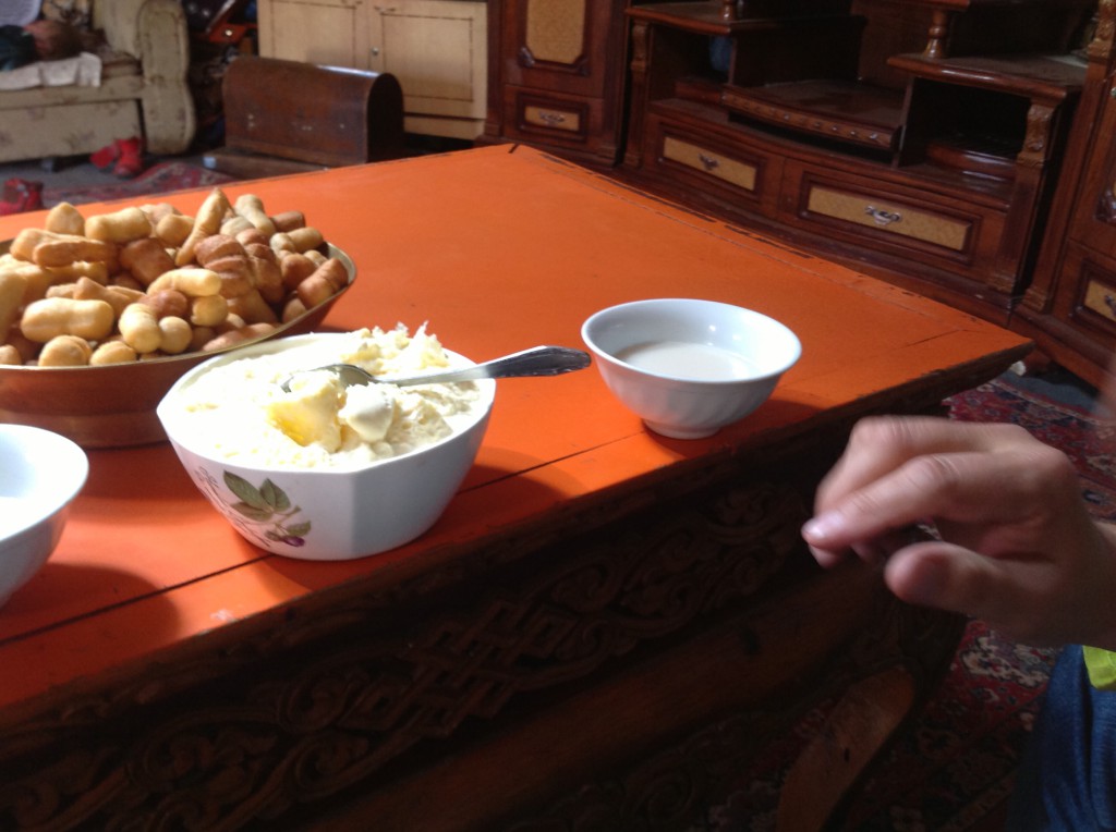 Ja niin alkoi matka takaisin Ulan Batoriin. Paluumatkalla kävime Nomidi-perheessä. Siis aidossaa jurttakodissa. Perheen pää isä oli päivätyössään paimenena. Menimme sisään jurttaan ja kahden lapsen perheen äiti aloitti perusteellisen käsien pesun aina kyynärpäitä myöden, hyvin saippuoiden. Eli hygienia oli hallussa. Sitten pöytä pyyhittiin uutterasti hangaten puhtaaksi. Ja eikun pötyä pöytään. Pienet sormen paksuiset pötkylät maistuivat munkkirinkeleiltä. Ei kuitenkaan niin makeilta, koska mausteena ei ollut sokeria. Muutoin syötävän hyviä. Niin, ja tietenkin juotavaksi teetä, jossa oli maitoa ja suolaa mausteeksi. Ensin hiukan arvelutti, että mikähän mahtaa olla makuelämys? Joimme kupit tyhjiksi ja kiittelimme emäntää tarjoilusta. Paluumatka UB:iin jatkui hiljaisuudessa. Väsyneet, mutta paljon nähneet ja kokeneet matkalaiset saapuivat takaisin hotellille.