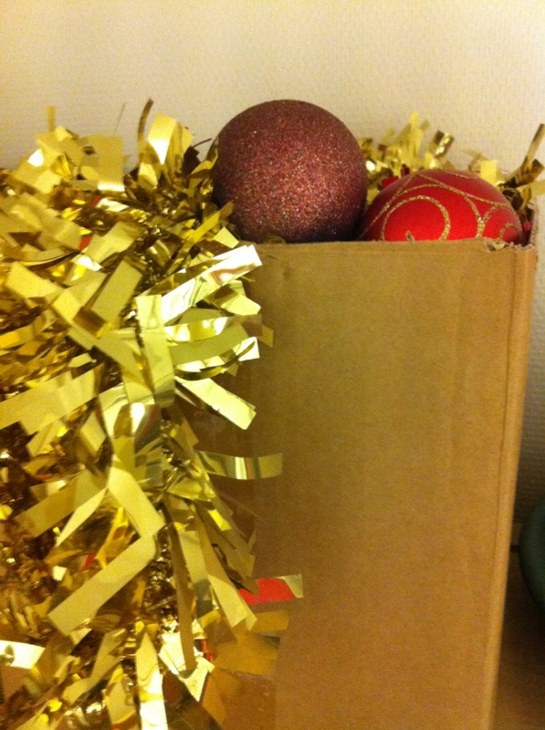 Uskolliset joulukoristeet odottavat koko vuoden ruokalan kirjahyllyn päällä pahvilaatikkossa lyhyttä esiintymistään kuusen oksilla.