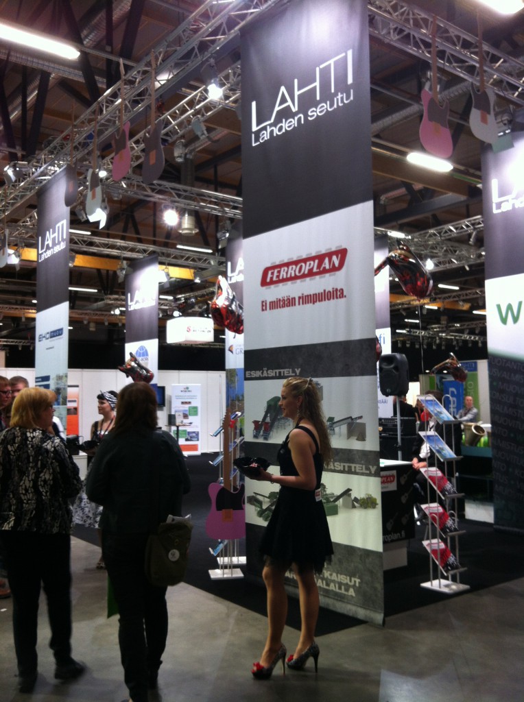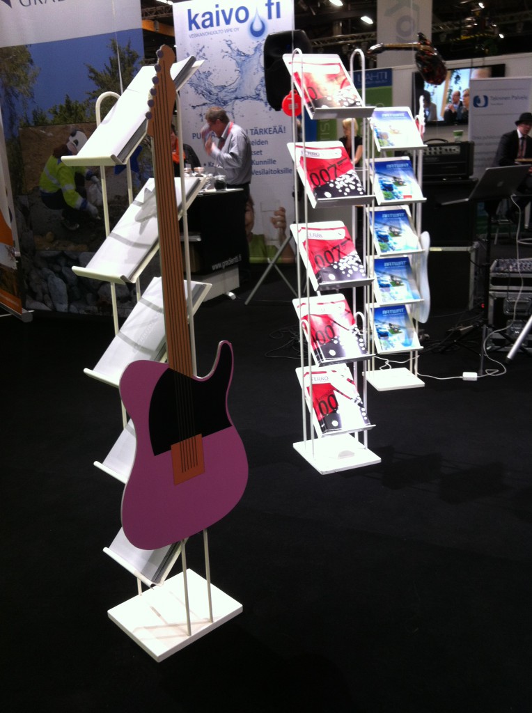 Hyödynsin härskisti kaikki juhlista jääneet koristeet messuilla. (Tämän takia vuoden kerrallaan kestävä teema markkinoinnissa on kätevä ja kustannustehokas). Haastetta tuotti ajaa Orimattilasta Jyväskylään kahdeksan ison, täynnä olevan heliumpallon ja muiden messukamojen kanssa, mutta niin vain siitäkin selvittiin. Ilmapallojen kunto alkoi messuilla olla vähän nuupahtamaan päin, kun juhlista oli jo kulunut useampi viikko, mutta ei kai sen ole väliä, millainen keskustelun avaus osastolle saapuvan asiakkaan kanssa on… (ja kyllä niistä kitaran roikkuvista kauloista sitten saikin monen monta keskustelua aikaiseksi).