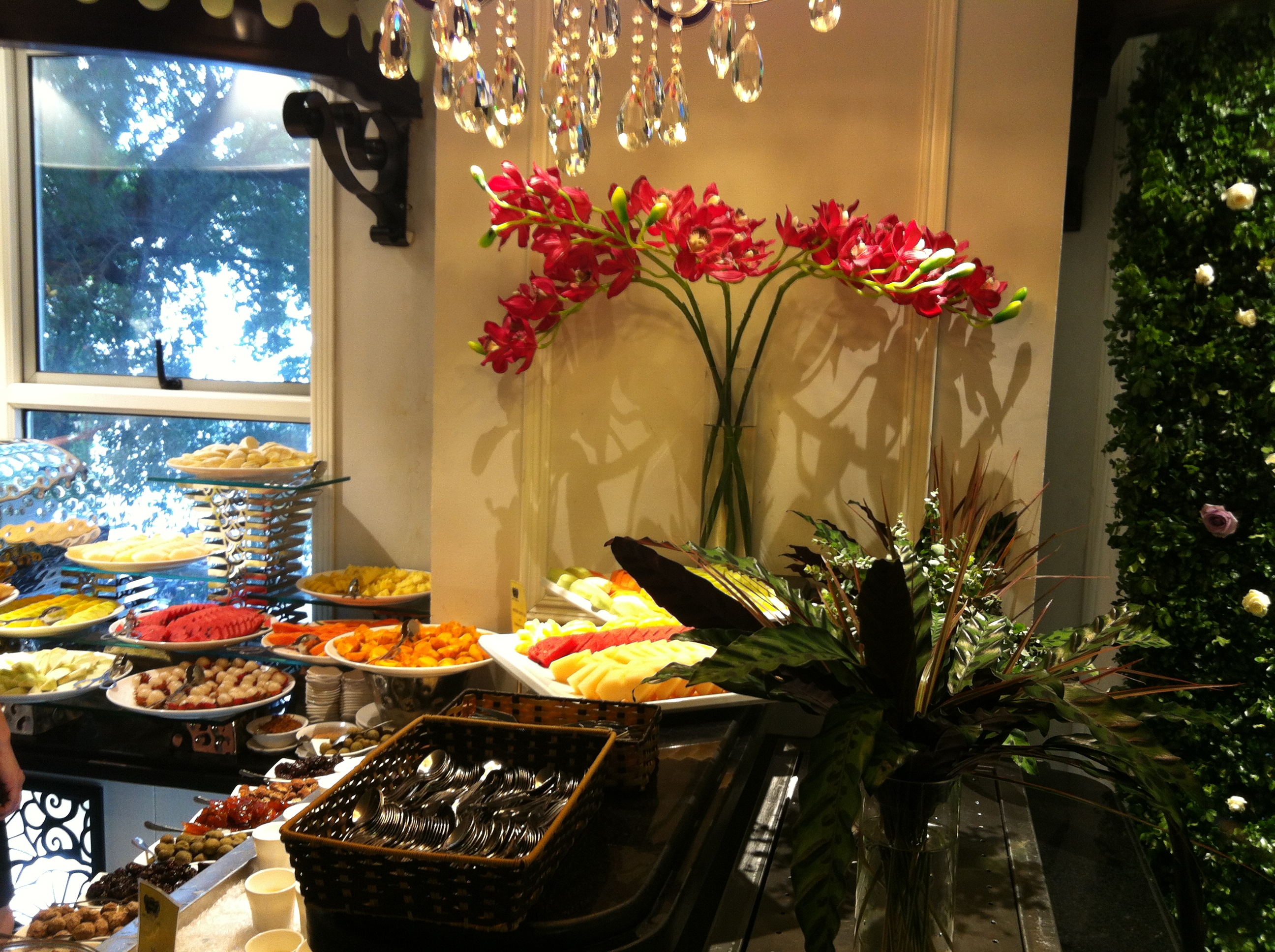 Naistenpäivän buffetissa lounaalla. Tarjolla oli mm. alligaattoria ja monin eri tavoin valmistettua sian mahaa ja korvia. Paikalliset hedelmät ovat aivan vertaansa vailla!