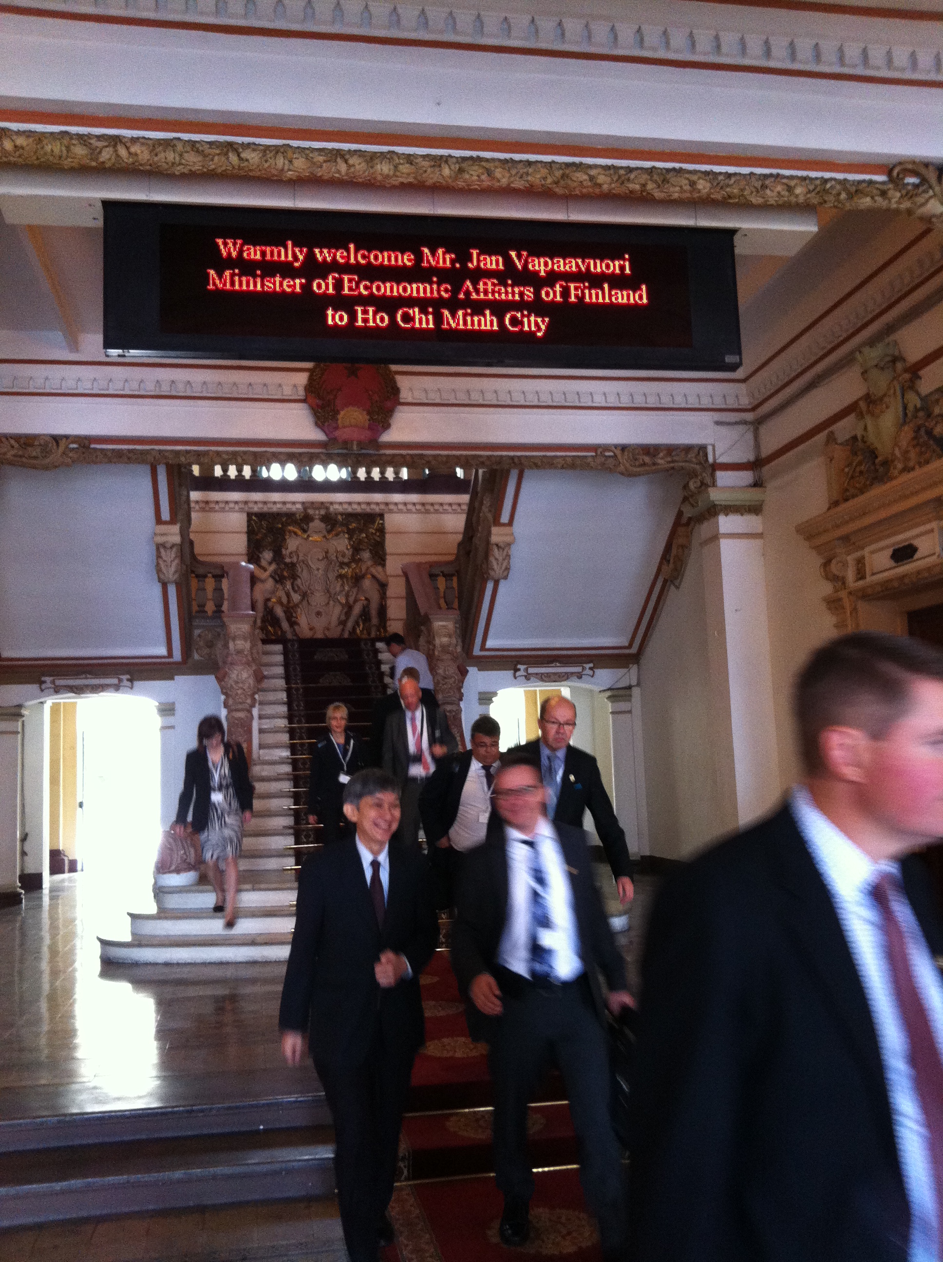 Suomalaiset otettiin joka paikassa kohteliaasti ja näyttävästi vastaan. Ho Chi Minh Cityn parlamenttiin meidät toivotettiin tervetulleiksi näin.