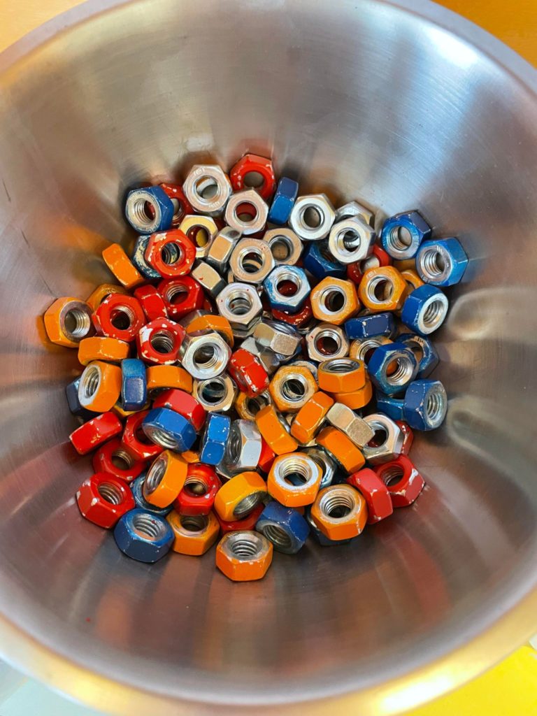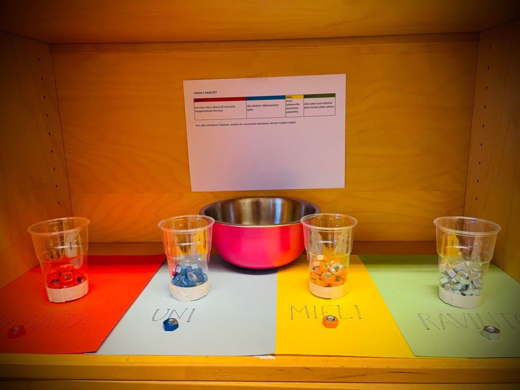 Ohje on, että aina, kun homma on hoidettu, pudotetaan värillinen mutteri aihetta vastaavaan mukiin. Mukissa oleva raja kertoo perjantaina, ovatko viikon Haasteet läpäisty vai ei. Tarpeeksi viikkoja läpäisemällä meitä kaikki odottaa yhteinen yllätys (joka on yllätys vielä itsellenikin!). Viikon voi läpäistä vain niin, että jokaisessa mukissa on riittävä määrä muttereita. Siis tasapaino ratkaisee.